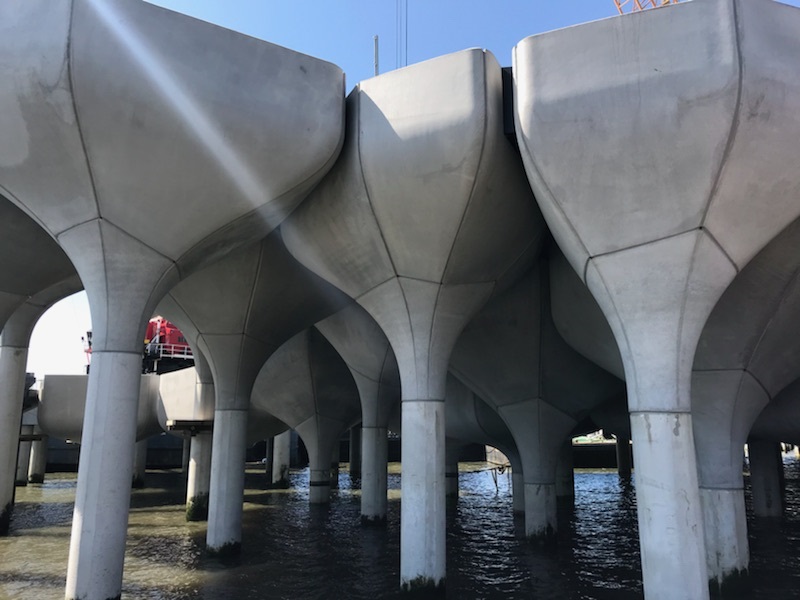 At its heart, Pier 55 stands tall on 132 one-of-a-kind precast concrete supports. These unique supports are an embodiment of creativity, with five gracefully curved petals enveloping a central column head, and no two petals are alike. A symphony of concrete, steel, and form takes shape in this extraordinary landscape.